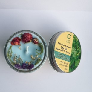 Nến thơm tinh dầu hoàn toàn sử dụng thành phần tự nhiên từ: sáp ong, sáp đậu nành, sáp cây cọ, hoa khô thật và tinh dầu BẠC HÀ