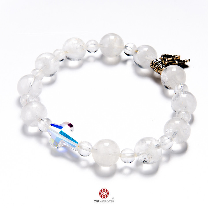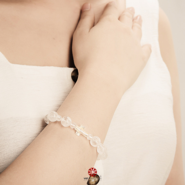 (Chuỗi Mân Côi thạch anh ưu linh trắng 10mm mix Thánh Giá pha lê)