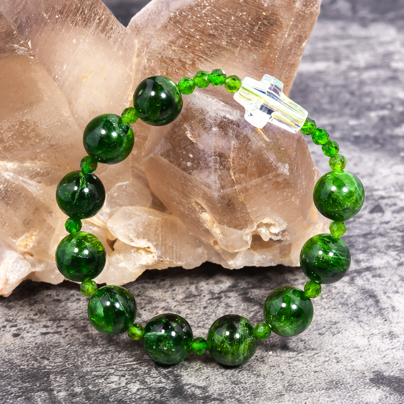 Vòng tay đá phong thủy Chuỗi Mân Côi đá Diopside Cỡ hạt 10mm phù hợp cả nam và nữ - xen kẻ các hạt nhỏ cùng chất liệu Diopside - kết hợp cùng Thánh Giá Pha Lê - hợp mệnh Mộc, mệnh Hỏa